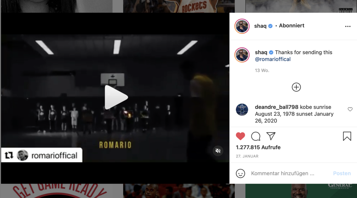 Aus diesem Anlass wollten ein Tribute Video über Kobe Bryant drehen. Wir luden Deutschlands bekanntesten Streetballer und Dribbelkünstler dafür ein. Romario (IG Account = romariofficial und seinen Kameramann Thomy nach Hamburg ein. Rausgekommen ist eine sehr schöne Erinnerung an Kobe und Gigi. Das Video wurde ca. 380.000 mal auf Romarios Account aufgerufen. Dann postete es Kobes alter Mitspieler Shaquille O´Neal (@shaq) auf seinem Instagram Account. Dort wurde es 1,2 Millionen mal angesehen. Scottie Pippen, Dwight Howard, Shawn Marion, Kenyon Martin und weitere NBA Spieler aber auch Hollywood Stars wie Jennifer Lopez, Jessica Alba und der Fußball Star Ronaldinho haben sich in der Kommentarleiste verewigt.